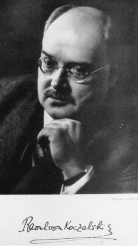 Raoul Koczalski, Raul, von, pseudonym Georg Armand, born 3 January 1884 in Warsaw, died 24 November 1948 in Poznań, Polish pianist and composer. His first music teachers were his parents. In 1888, at the age of 4, he gave his first concerts in Warsaw (15 March) and Riga (31 October), starting his career as a “child prodigy” (he played mazurkas and waltzes by Chopin, among other pieces). At the age of 7 he received the prize of the Paris Conservatory (Premier Prix d’Enfant), and also the title of court pianist to the King of Spain, the Shah of Persia and the Sultan of Turkey. He performed all over Europe, his repertoire included pieces by Bach, Beethoven („Waldstein Sonata”), Liszt, Anton Rubinstein and Paderewski; in 1896 he celebrated his 1000th concert in Leipzig. He took lessons from Anton Rubinstein in St. Petersburg, and he continued his music instruction in Warsaw with J. Gadomski (piano), in Lviv with H. Jarecki (instrumentation), L. Marek (piano) and in the years 1902-1905 with K. Mikuli (piano and composition). He also studied musicology and philosophy at the university in Paris. As a result of his busy concert career, he spent most of his time abroad; he lived mainly in Germany (Wiesbaden, Leipzig and Berlin). During WWII, he was repressed by the German government. He was forbidden to perform publicly or to leave Berlin; despite this he organised concerts at home for his friends and students. He returned to Poland in 1945 and became Professor of the piano class at the PWSM in Poznań and Warsaw, and continued his concert career. He had planned numerous performances for the 100th anniversary of F. Chopin’s death in 1949. Koczalski’s performances of Chopin’s works are published in recordings by Columbia, HMV, Muza, Odeon, Polydor, Pearl CD („Raoul Koczalski Plays Chopin”). In recognition of his work in developing Polish culture he was awarded the