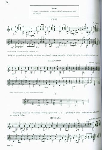 The most popular guitar playing tutor-book. At the beginning the student is acquainted with the instrument: its component parts, the way it should be held, and the indications of fingers and strings. In the preface the author also provides general remarks on sound production and ways of practicing. In the subsequent parts of the method the student gains knowledge of the keys, articulation, ways of playing chords and positions etc. The chapters entitled ''Repeating Our Knowledge about Music'' are an important element of the book as they enable the student to systematize the knowledge he has acquired.