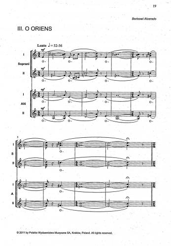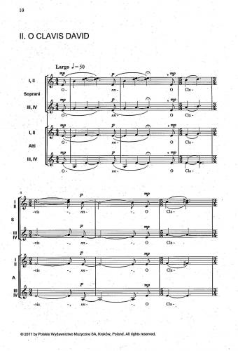 The first collection in the Coro Religijne series, consisting of pieces for female choir a cappella arranged by Paweł Łukaszewski. There are 4 antiphons: O Radix Jesse, O Clavis David, O Oriens and O Rex Gentium. Each antiphon retains the unique nature of prayer, harmony dominated by chords of seconds adds extra spice. The composer frequently operates on dense chord blocks, however there is also no lack of polyphonic passages or dialogue between voices. This is an important collection, enriching the somewhat scarce literature for female choir.