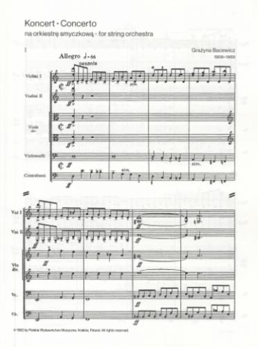 The first movement (Allegro) - in the form of an early classical sonata allegro - begins with a subject with energetic figurations, emblematic for the whole piece and based on a constant, pendulum-like semiquaver movement anchored securely on D. It is precisely because of the nature of this subject that Bacewicz's work has been compared to the Brandenburg Concertos by Jan Sebastian Bach