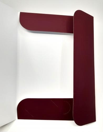 Elegant burgundy cardboard folder coated with luminous foil, both N and A4 size. Covered in hand-written sheet music by Grażyna Bacewicz herself.