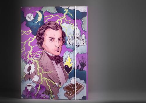 A colorful folder coated with luminous foil, A4 size, with an illustration by Mateusz Kołek, encouraging both specialists and amateurs to search for hidden content about the life and work of Fryderyk Chopin.