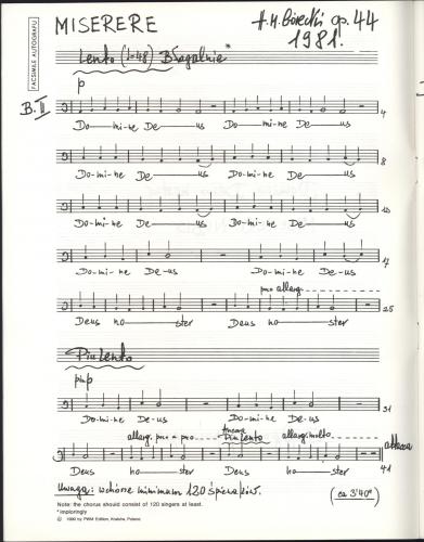 Miserere for large unaccompanied mixed choir is Górecki's reaction to the events of 19 March 1981, which took place in Bydgoszcz. On that day clashes occurred between representatives of the Rural Solidarity and c. 200 militia men, as a result of which many union members sustained wounds; several months later the martial law was declared. Miserere is Górecki's ''musical manifesto'' (the only one the composer allowed himself to make in his lifetime) directed against the regime of the Polish government of the 1980s. It is understandable that the work was presented publicly only 6 years after its composition. The treatment of the choir is quite exceptional here, as each of the eight parts (2S 2A 2T 2B; 120 singers at least) has its own line, considerably diversified in the course of the composition. It is also interesting that the entire work remains within one harmonic field, the skeleton of which is formed by a progression of diatonic thirds (from A in the second basses to a' in the second sopranos). The verbal layer is limited to five words only, but they are very meaningful: ''Domine Deus noster, Miserere Nobis''. Paradoxically, however, that verbal economy, combined with the formal and tonal evolution of the work, requires masterly performance, as Miserere is a work with great emotional charge. According to Ivan Moody, the author of an article in The Musical Times (1992), the music of Miserere, endowed with ''tension, which is astonishing to the highest degree, is built up to the extremes of almost unbearable intensity, and then freed from the tension (...) in an atmosphere of meditative peace''.