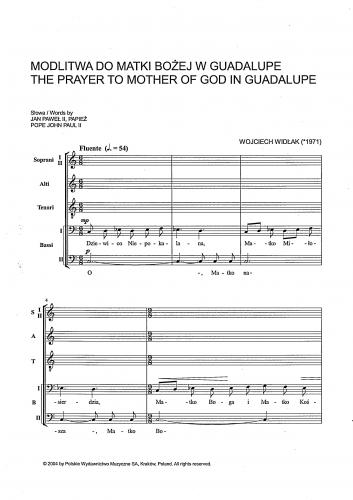 In the first version ''The Prayer to the Mother of God in Guadalupe'' is scored for mixed choir, brass instruments, percussion and double basses. Its premiere took place in Cracow on 8 May 2000. Soon afterwards, bearing in mind the practical performing aspect, I made the present version for unaccompanied mixed choir. Both versions of the composition are typically sacred in nature: the music plays a subservient role to the deep, universal content of the prayer. The vocal-instrumental version has clearly solemn overtones, while the a cappella version introduces the listener to the more austere atmosphere of contemplation and personal prayer. The verbal layer of the composition consists of excerpts from the prayer delivered by the Holy Father in Mexico in January 1979. I heve arranged them so that they form a kind of litany, starting and ending with the same main invocation. The musical language of the work, simple and intelligible, contains some archaic elements. It ought to harmonise with a church interior and help in prayer. That is why ''The Prayer to the Mother of God in Guadalupe'' is, above all, suitable as a setting for Catholic services (especially those which are ''Marian'' in content), and enriches the choral music repertory at the same time. [Wojciech Widłak]