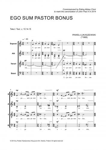 Kompozycja Ego sum pastor bonus na chór mieszany a cappella powstała w styczniu 2014 roku. Utwór został napisany w hołdzie Janowi Pawłowi II, który 27 kwietnia 2014 roku został ogłoszony Świętym.