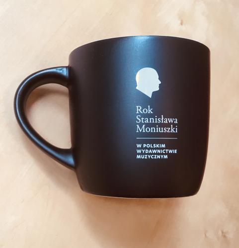 Elegancki czarny kubek kryje na dnie grafikę z profilem Stanisława Moniuszki. Kubek powstał na pamiątkę Roku Moniuszkowskiego.
