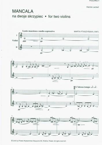 ''Mancala'' na dwoje skrzypiec powstała w 1997 dla Hanny Lachert z okazji jej 25-lecia pracy w New York Philharmonic Orchestra. Prawykonanie utworu odbyło się 18 kwietnia 1997 na koncercie w Fundacji Kościuszkowskiej w Nowym Jorku. ''Mancala'' to nazwa ulubionej matematycznej gry cyfrowej faraonów egipskich, znana też jako ''gra w kamyki''. Popularna był również w starożytnej Azji i Afryce. W grze biorą udział dwie osoby, a wygrywa ten, kto zdobędzie wszystkie pola przeciwnika, zapełniając je swoimi kamykami. W utworze wygrywają obaj muzycy.