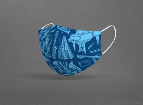 Granatowa maseczka ochronna z motywem instrumentów i elastyczną gumką na uszy. Maseczka z gumką w rozmiarze uniwersalnym, dopasowuje się do wielkości twarzy.