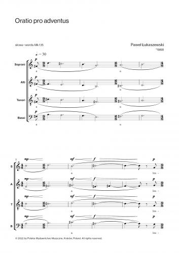 Oratio pro adventus to niezwykle zwięzły utwór (zaledwie 45 taktów) przeznaczony na 4-głosowy chór mieszany a cappella i opracowany w czterech wersjach językowych (łacińskiej, polskiej, angielskiej i niemieckiej). Z pewnością wykorzystać go można podczas celebracji liturgicznej. (...) Kompozycja napisana została językiem muzycznym typowym dla twórcy – dalekim od eksperymentów i rozwiązań awangardowych, wpisującym się w nurt neotonalny i przesiąkniętym łagodnym, eufonicznym brzmieniem.
