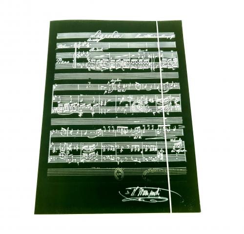 Elegancka kartonowa teczka w nietuzinkowym, ciemnozielonym kolorze, z motywem nutowym oraz autografem Henryka Wieniawskiego.