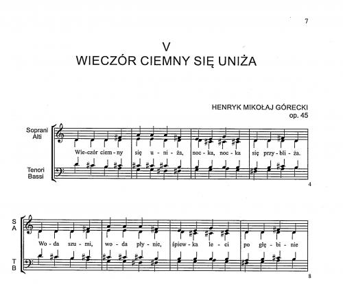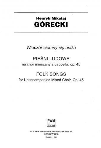 Cykl pieśni ludowych ''Wieczór ciemny się uniża'' op. 45 na chór mieszany a cappella został skomponowany w październiku 1981r. Teksty i melodie zostały zaczerpnięte ze zbioru Jadwigi Gorzechowskiej i Marii Kaczurbiny ''Jak to dawniej na Kurpiach bywało''.